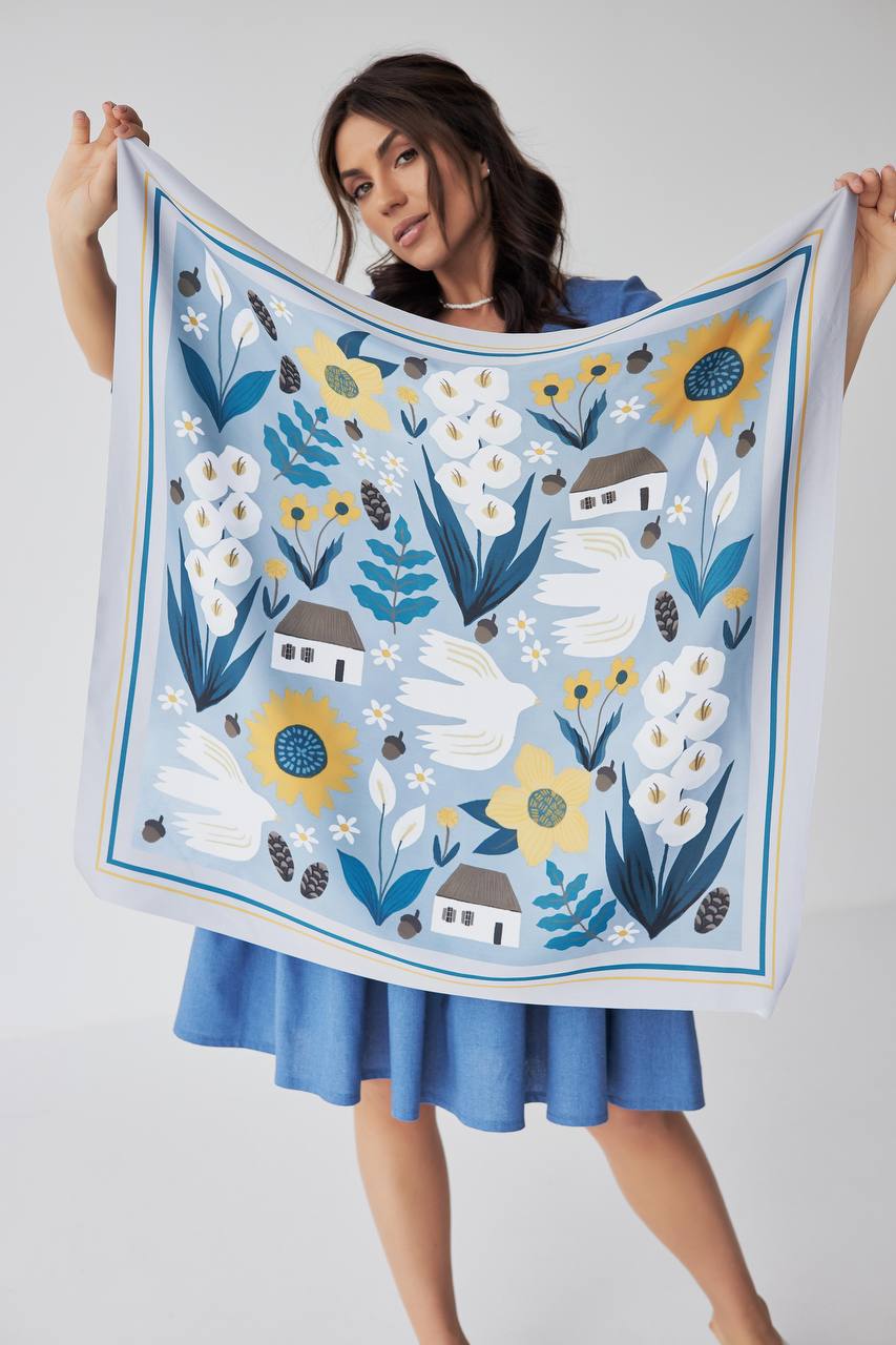 Хустка Українське село виконана з штучного шовку марки Армані. Розмір 77/77 см. Вона доповнить Ваш образ та може стати гарним подарунком