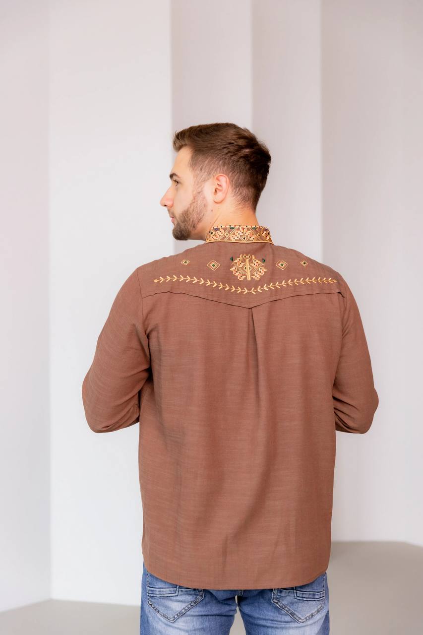 Чоловіча вишиванка Залісся (коричнева) виконана на натуральній тканині.