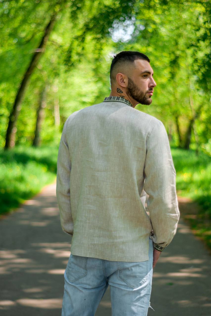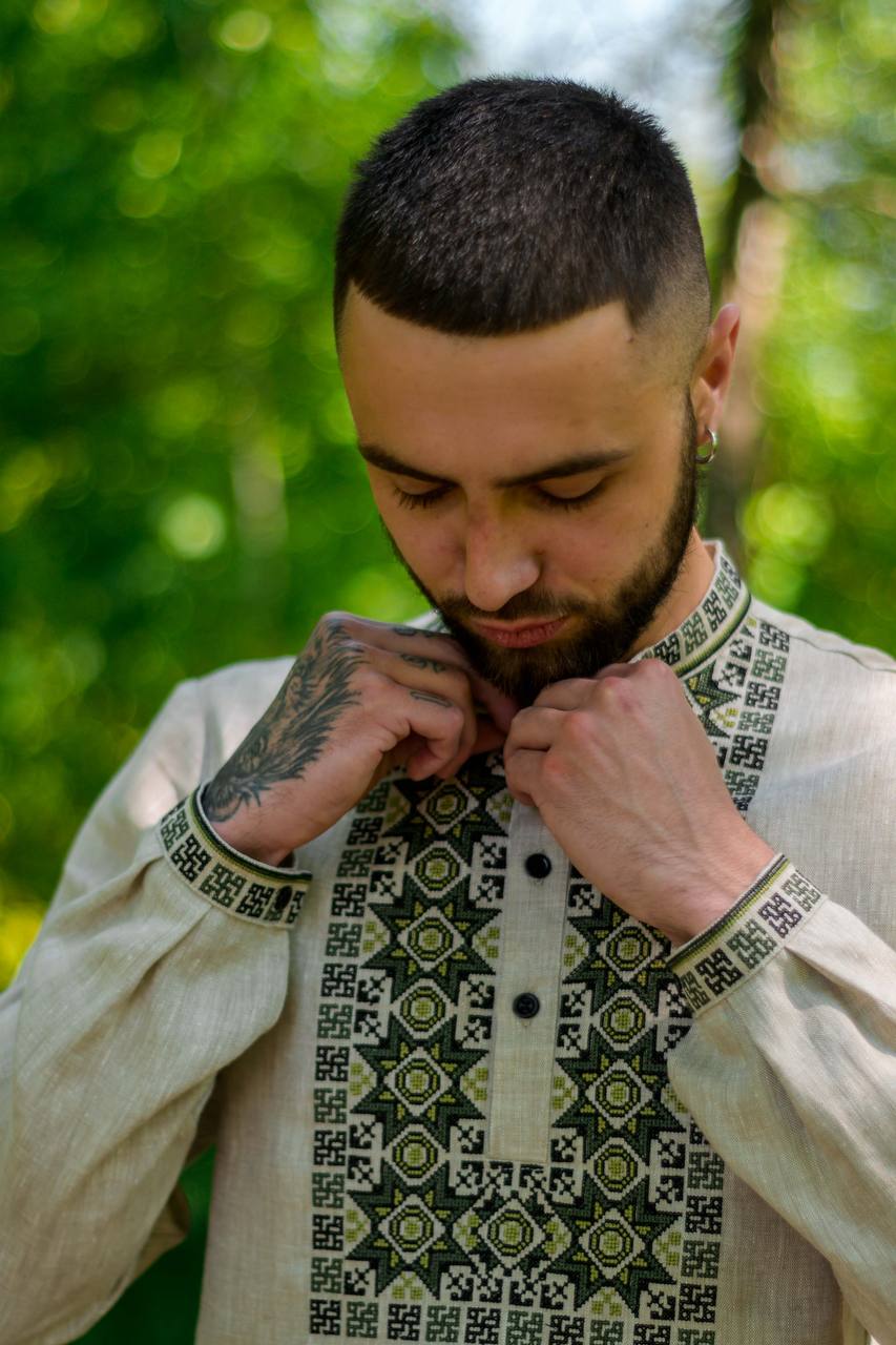 Чоловіча вишиванка Зірка (бежева)  виконана на льоні. Тип вишивки – хрестик.