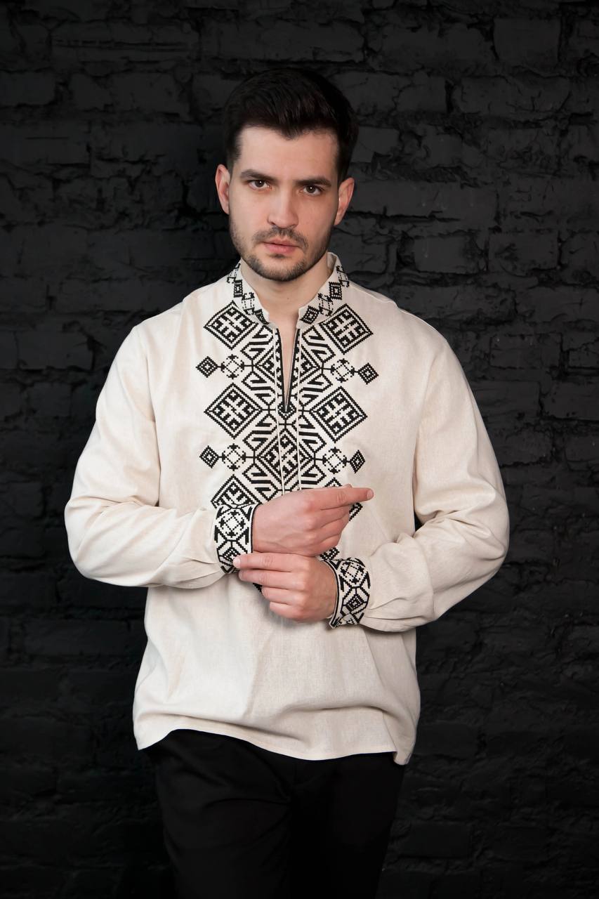 Чоловіча вишиванка Руна (молочна з чорним) виконана на натуральній тканині.