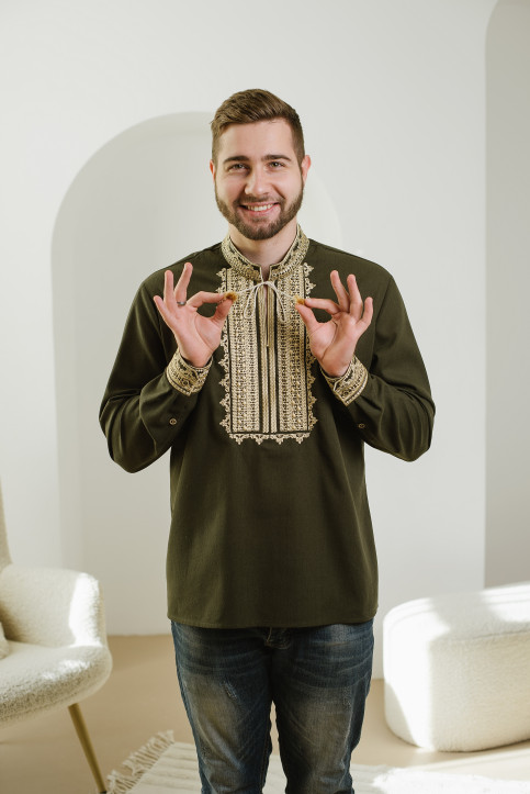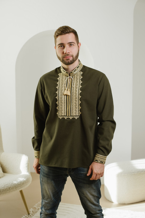 Чоловіча вишиванка Традиція (хакі з золотим)  виконана на льоні.